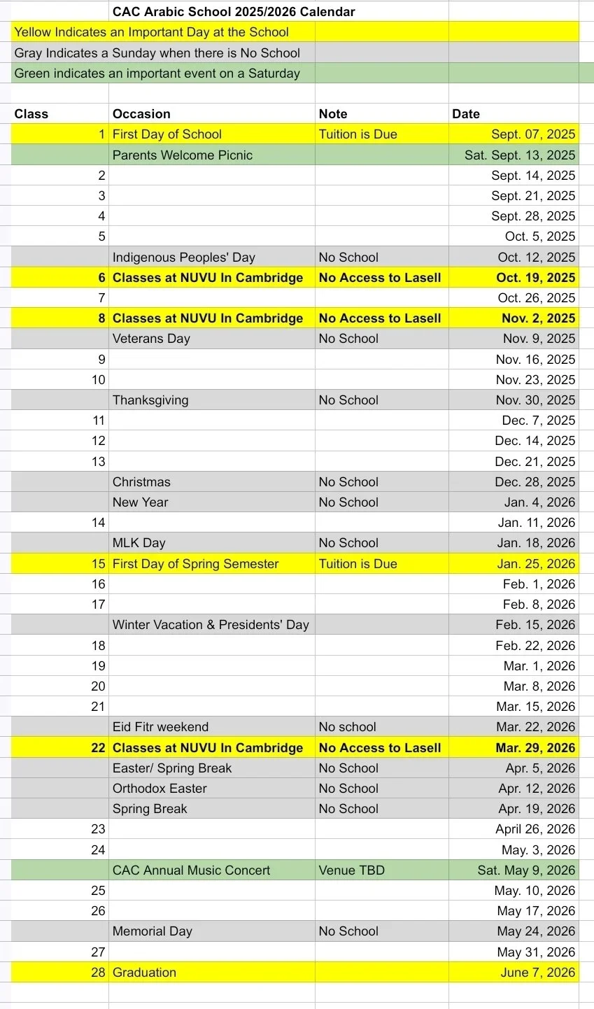 Classes will take place on Sundays following CAC Arabic School Calendar.